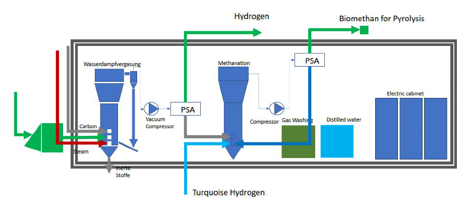 Das aus der Wasserdampfvergasung gewonnene Wassergas wird in Kohlenmonoxid und Wasserstoff aufgetrennt. Dazu wird eine Druckwechseladsorption verwendet. Neben Kohlenmonoxid gewinnt man auch noch geringe Mengen an Methan und Kohlendioxid. Das Kohlenmonoxid wird mit Wasserstoff zu Methan und Wasserdampf synthetisiert. der Wasserdampf wird beim Abkühlen als Kondensat gewonnen. Dieser Prozess ist stark exotherm, sodass die bei der chemischen Katalyse abgegebene Wärme zudem in Wasserdampf umgewandelt wird.
