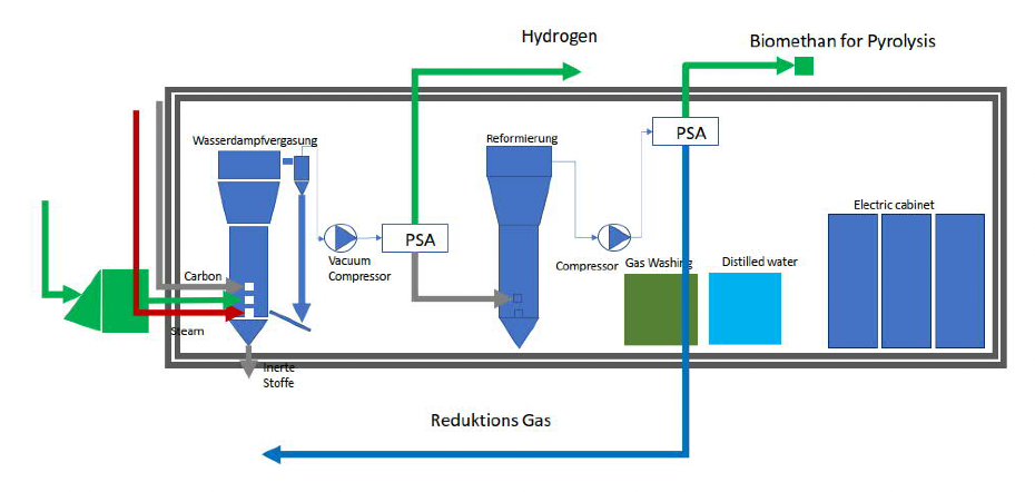 Stoffe aus (C/H/O) in Form von Feinteilen ( Fine Solids ) werden mit Wasserdampf zu Wassergas ( Heizwert 3,0 kWh/m³ bis 4,0 kWh /m³ ) umgewandelt. Wassergas besteht aus Kohlenmonoxid, Kohlendioxid, Methan und Wasserstoff. Der Umsetzungswirkungsgrad im Reaktor liegt bei 85%. der Wasserdampfprozess ist endotherm, es wird Wärme über den überhitzten Wasserdampf zugeführt. Der Prozess findet in einem stationären aufgeblähten Wirbelbett aus Dolomitsand angereichtert mit Eisenoxid ( FeO) statt.